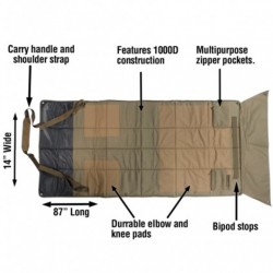 - La versión HD presenta una construcción 1000D, coderas y un tope de bípode incorporado, así como un asa de transporte y una correa para el hombro.