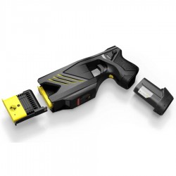 - HUSHA TX200P es compatible con tres tipos de cartuchos, que se pueden cargar en cualquier combinación. Hay 6 combinaciones de cartuchos en total; descargas eléctricas, spray de pimienta y cartuchos de sujeción remota.